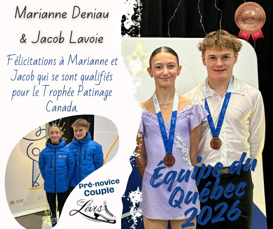 Marianne Deniau et Jacob Lavoie, duo pré novice en couple du Club de patinage artistique de Lévis, ont brillé aux récents championnats de section en remportant une superbe troisième place. Cette performance leur a permis de se tailler une place au sein de l’Équipe du Québec, une fierté immense pour eux, leur club et toute la communauté lévisienne. Félicitations à vous deux pour votre travail acharné et votre détermination sur la glace!