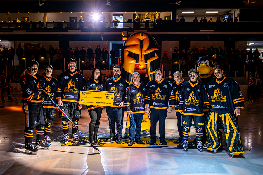 Lors de leur dernière partie locale de la saison régulière, les Chevaliers accueillaient les Riverains dans un match présenté au profit de la Fondation Hôtel Dieu de Lévis. À cette occasion, un chèque de 7 000 $ a été remis à la Fondation. Devant le filet, Zachary Lainesse protégeait la cage des Chevaliers.