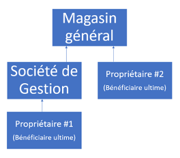 Qui sont ces bénéficiaires ultimes? Dans la majorité des cas, il s’agit des personnes qui contrôlent ou détiennent, directement ou indirectement, 25% ou plus des droits de vote ou de la juste valeur marchande des actions ou des parts d’une société. Prenons l’exemple de la détention en parts égales d’actions ordinaires d’un magasin général par une société de gestion et une personne physique :