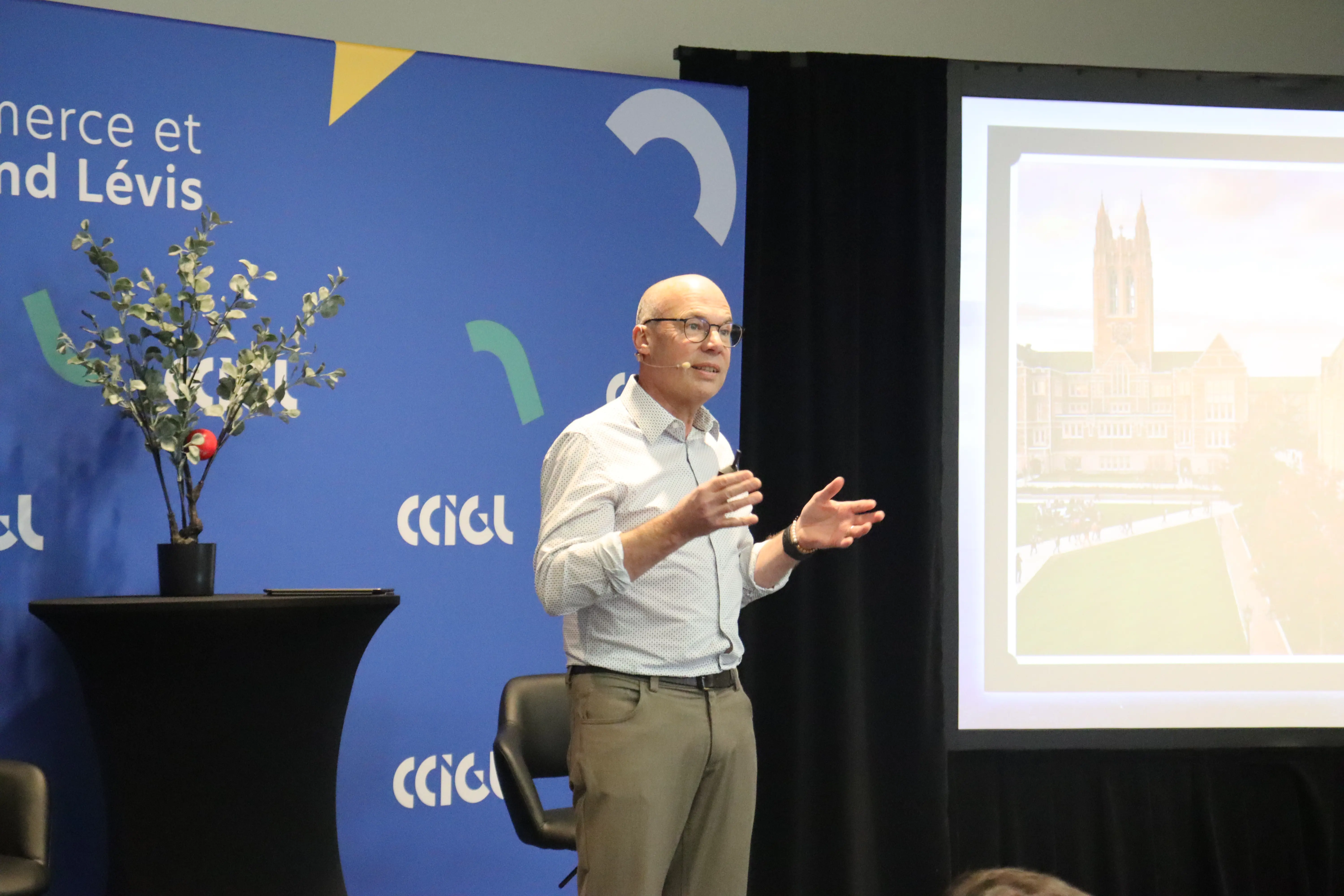 Celui qui est originaire de Saint-Georges a entrepris la conférence tenue devant une salle comble en racontant les grandes lignes de son parcours. Il a été diplômé du Boston College en 1987, avant de fonder son entreprise en technologie de l’information et de rejoindre Le Groupe Canam Manac inc. en 1989.
